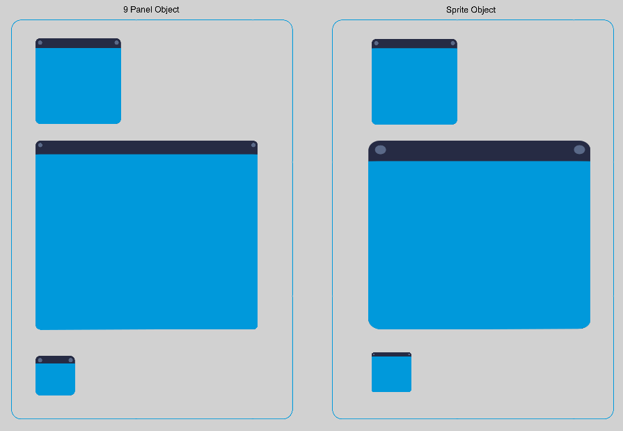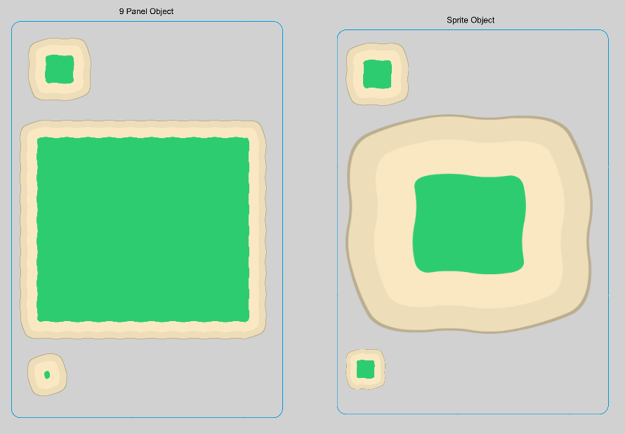 While the normal sprite object's image is scaled uniformly, the 9 patch sprite object's image is scaled as different segments, maintaining their proportion and the image's quality.
