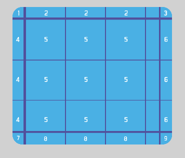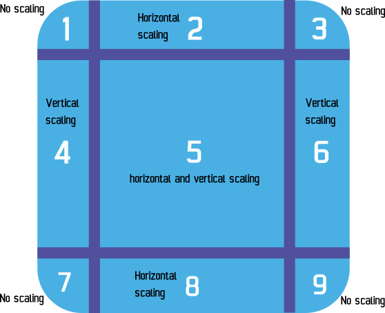 The texture is split into 9 segments, 1 to 9. Each of those segments will be scaled separately. Segments 1, 3, 7, and 9 keep their size and are not scaled, while segments 2 and 8 get scaled only horizontally, 4 and 6 get scaled only vertically, and segment 5 gets scaled both horizontally and vertically. Segments 2, 4, 5, 6, and 8 may repeat instead of scaling based on the panel sprite's object properties settings.