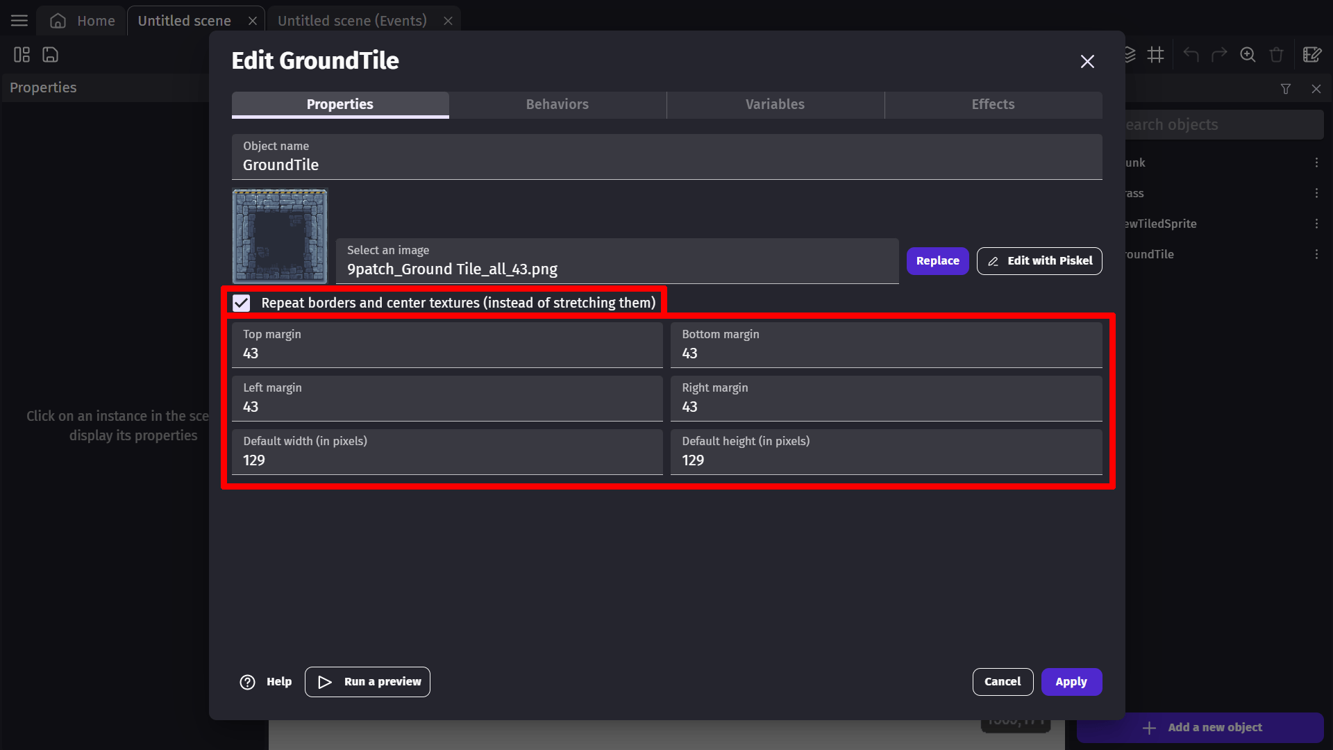 To use the Panel Sprite, create a new object from the Objects panel on the right. Once you've created the object, you can set the size of the margins for each border around the object. Margins are the top, left, right, and bottom lines that separate each segment. The default width and height in the object properties should represent the size of the total image used, in pixels.