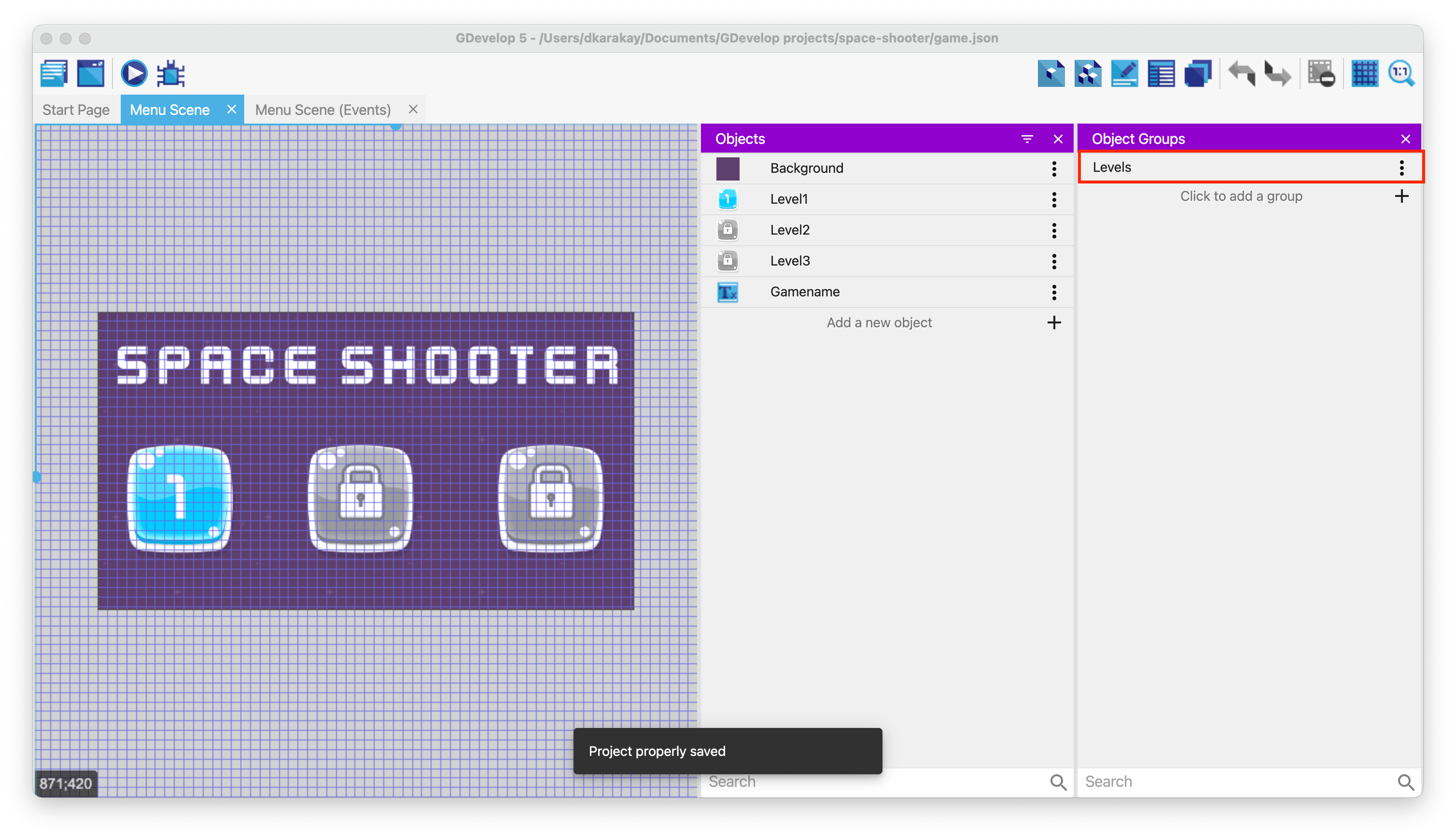 Then, create an object group for level objects called Levels.