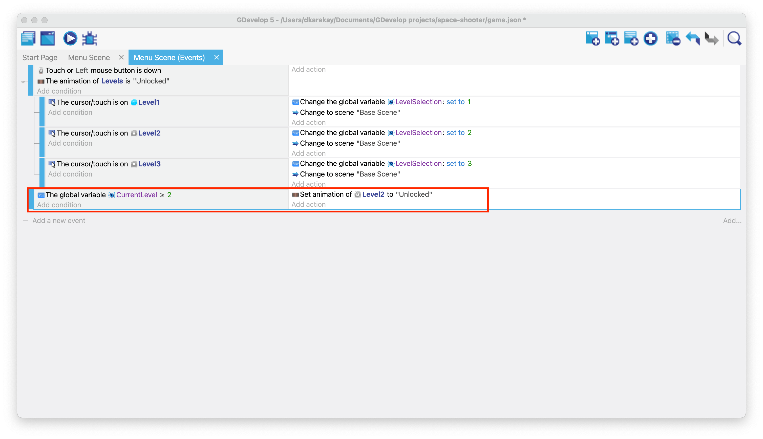 Create a new global variable called "LevelSelection" and set its initial value to 1. Then, change this variable to open the specific level (e.g., change it to 2 to load Level 2). Then add an action to run Base Scene. In the end, your events should look like this: